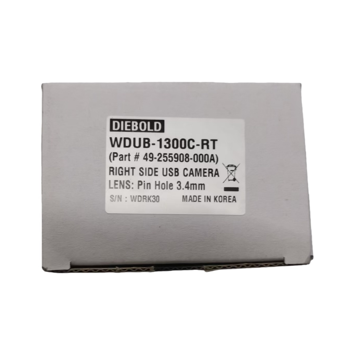 Diebold WDUB-13DDC-RT Micro Camera – Original New, Right Side USB Connector Type. This dedicated ATM camera is a genuine Diebold component, identified by part number 49255908000A and serial number WDRI300095, ensuring originality and quality assurance.
